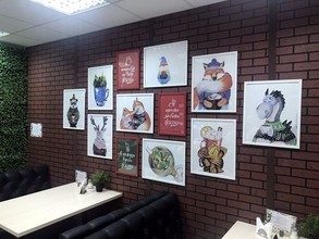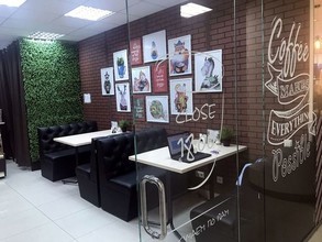 Внутри заведения стильный интерьер, оформленный в темных тонах, кирпичная стена декорированная картинами нарисованных животных с чашкой кофе, а также витрина с аппетитными десертами. Посетители могут присесть на удобные кресла или мягкие диванчики.
